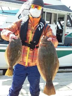 ヒラメ 42cm〜63cm。1〜4枚。船中16枚。