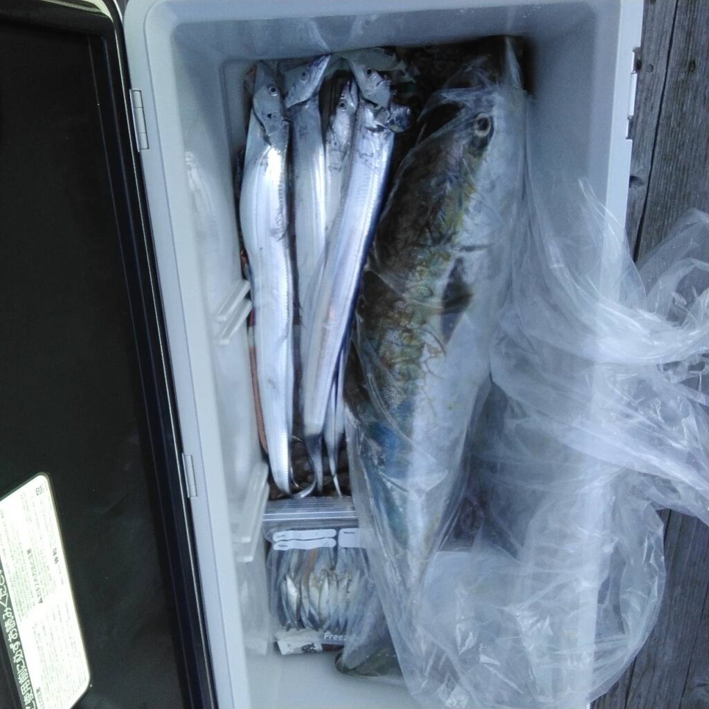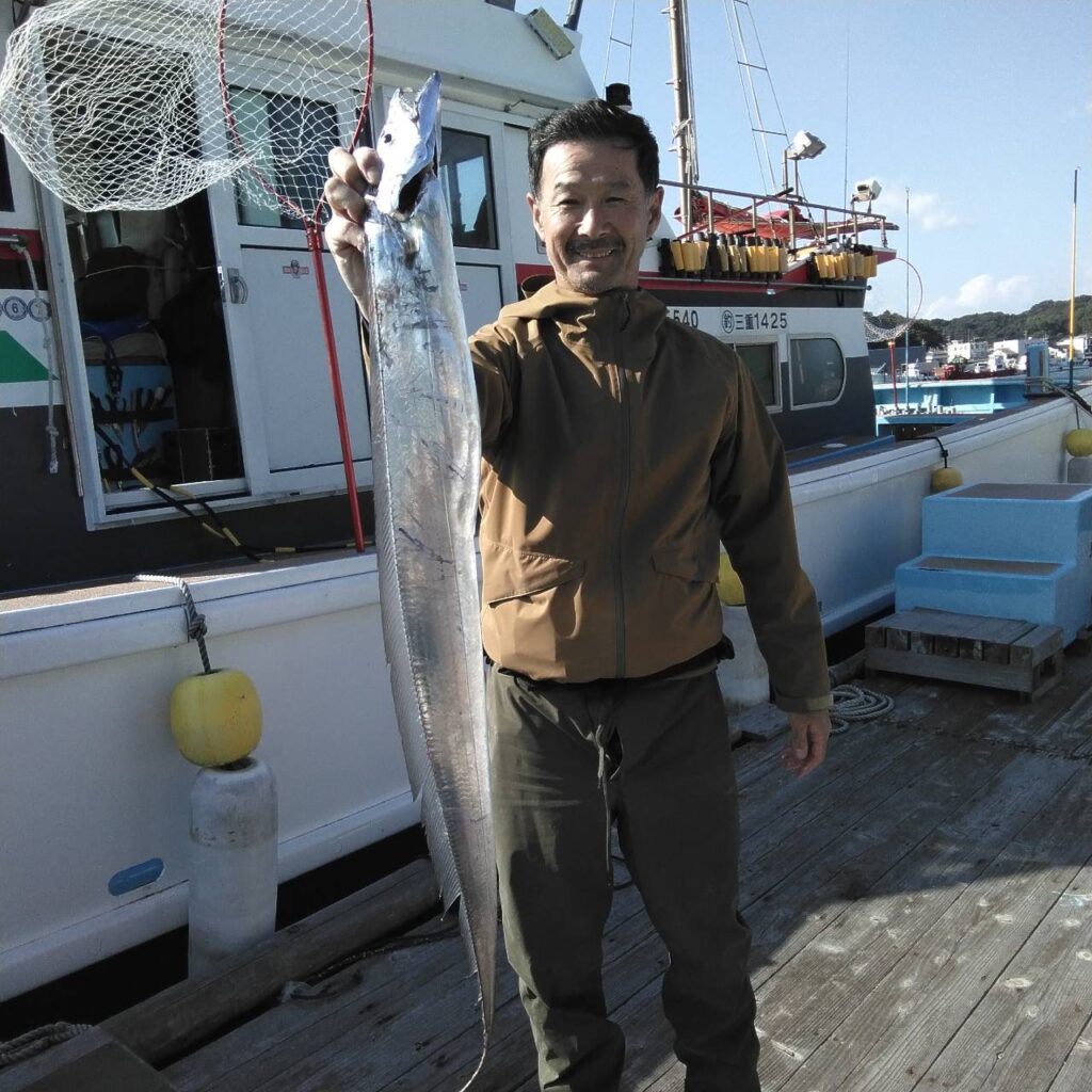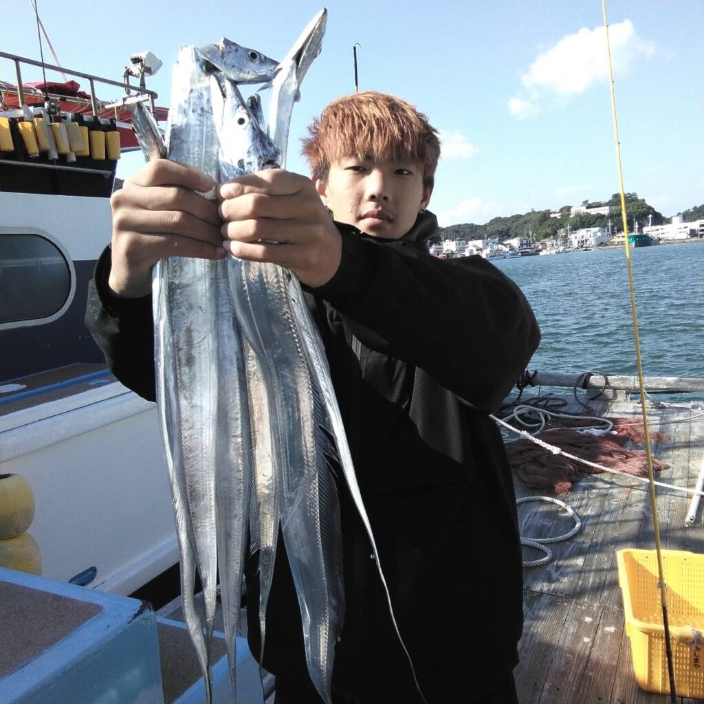 ロングも持ってきてくださいね。タチのいつものポイントに走り、風と波が高くバタバタと危ないので、湾内に戻り、チビタチがポツリポツリと釣れただけでした。