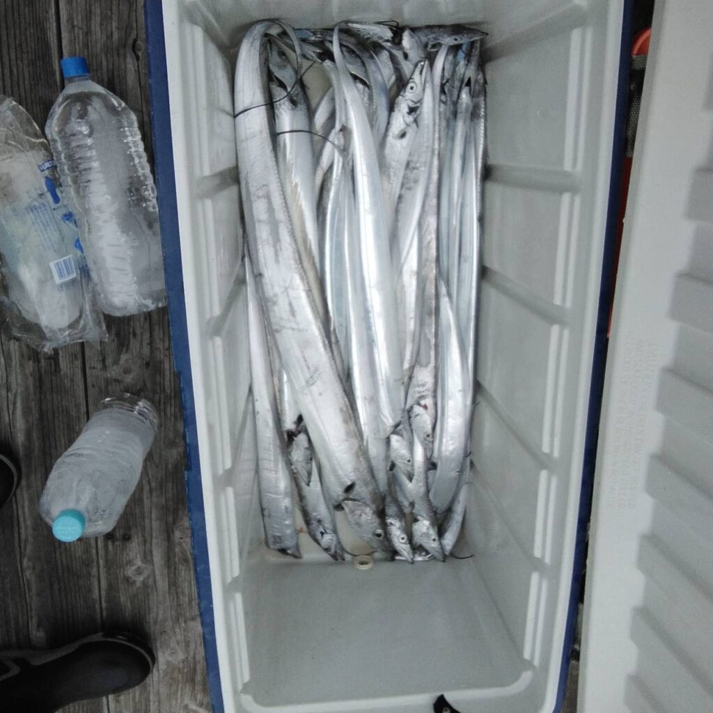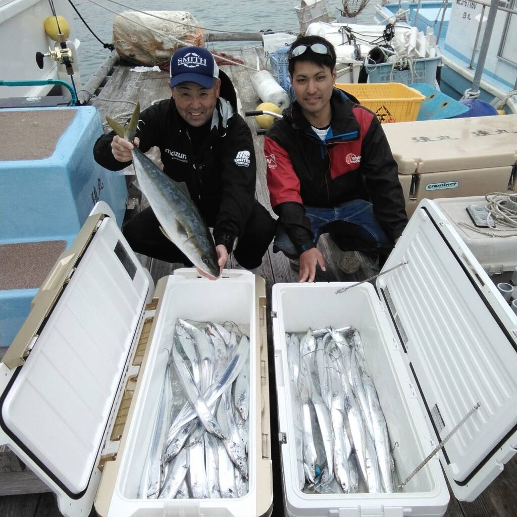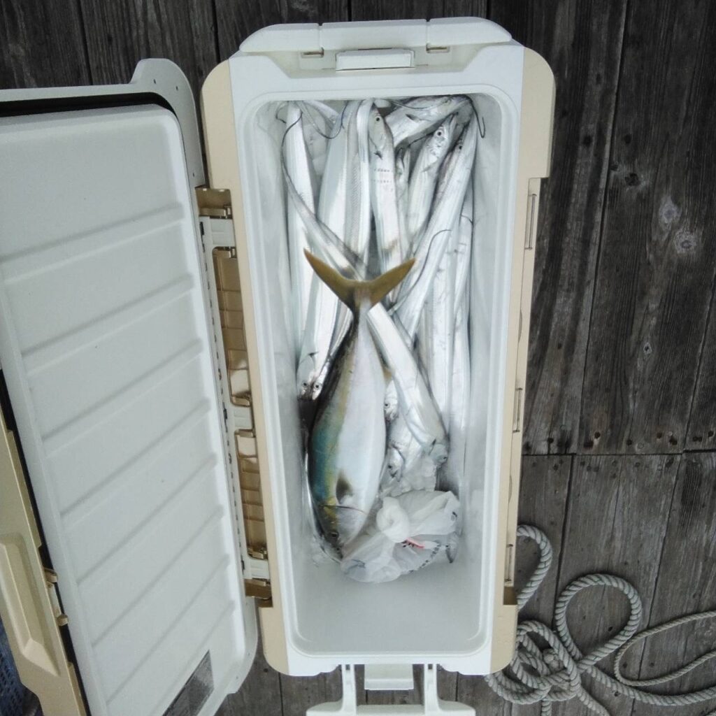 一発目からヒットしたので今日はいける!と思ったが…後が続かずで鳥山もなく、反応も悪く、タチウオに走り、ポツポツと釣れました。
