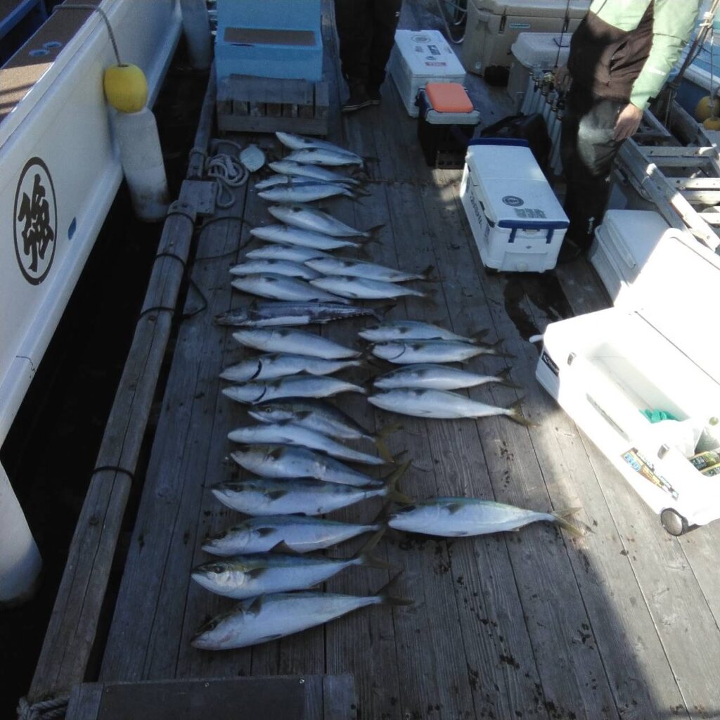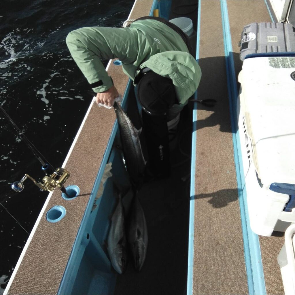 今日も出ましたよ。朝一からワラサがバタバタと釣れましたよ。風も朝の内は、大した吹かずで段々と強くなってきたので、みなさんクーラーいっぱいになったので、湾内に戻り、サワラをゲットしました。ブリはタカギレでバラシました。残念でした。みなさん、よく釣ってくれました。クーラーいっぱいでじじぃのおかずを生簀に入れていってくれましたよ。
