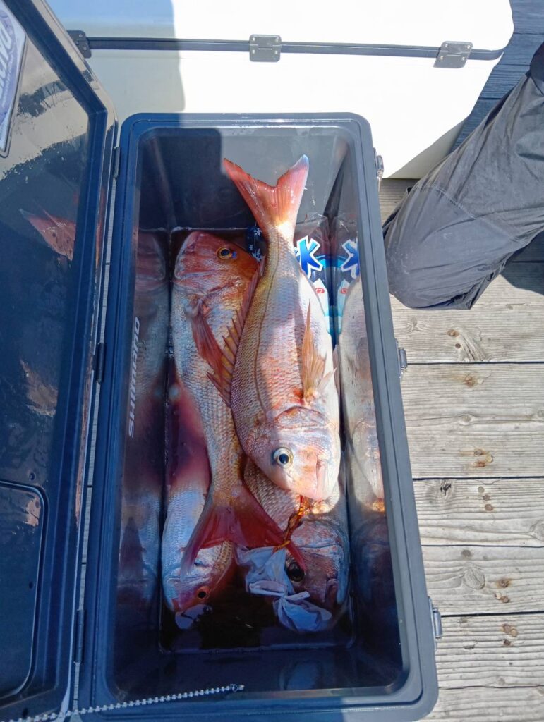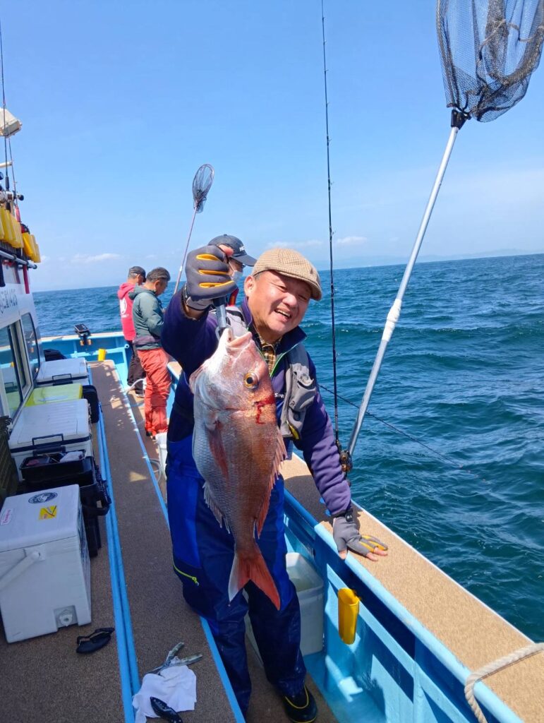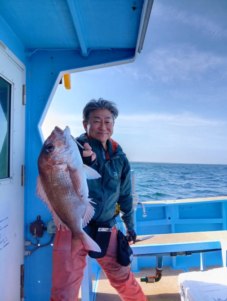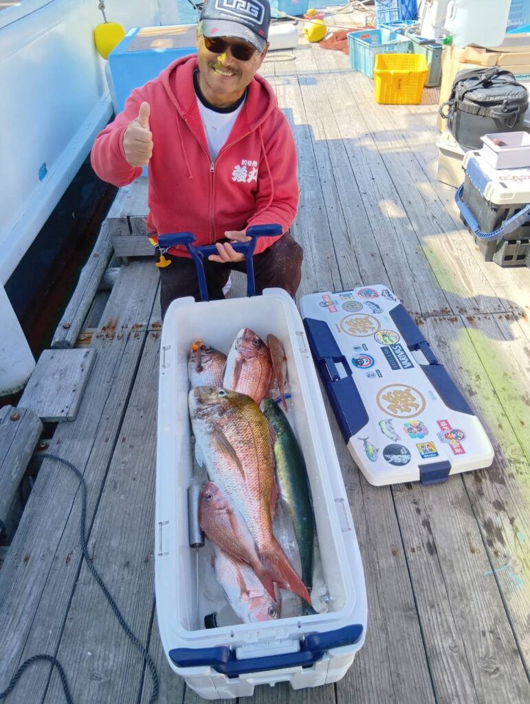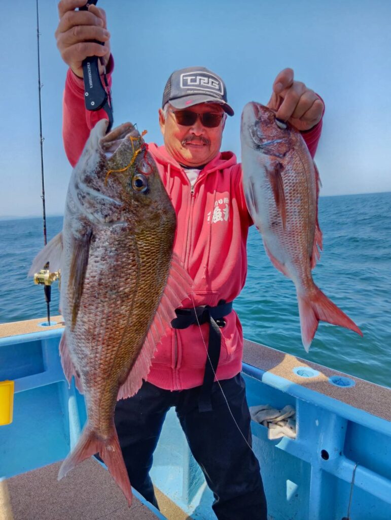 今日も出ましたよ。朝から波も高くて船酔いしている方もいましたよ。段々波もおさまりタイラバでマダイがよく釣れましたよ。3匹もエントリーサイズ釣っていましたよ。